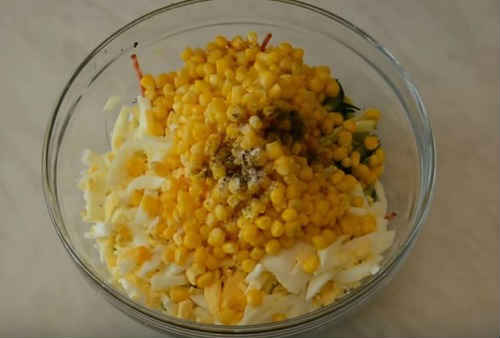 - Додайте до них кукурудзу з баночки, слив консервант.