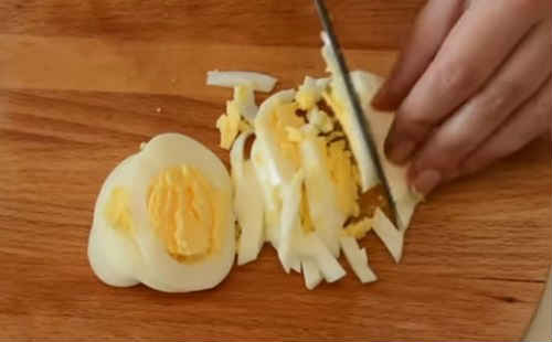 - Завчасно зваріть яйця. Наріжте брусочками.