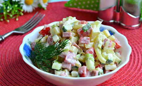 Прості і смачні салати міцно увійшли в наше повсякденне харчування, прикрашають стіл у свята, завжди привертаючи увагу в першу чергу. До речі, особисто я навіть знаменитий Олів’є роблю з копченим представником ковбаси. І вважаю цей варіант найбільш смачним.