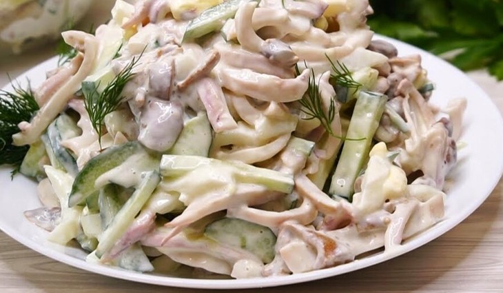 Дуже смачний, ніжний і оригінальний смак салатик, його ще називають «Виноградне гроно». Як правило зі столу відлітає одним з перших, всі їдять і нахвалюють. Часто готую на свята, дуже смачно!