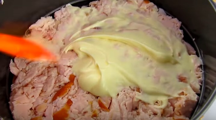 1. Грудку нарізати на дрібні шматочки. Якщо є роз’ємна форма кладемо її на велике плоске блюдо і заповнюємо курячим м’ясом. Якщо немає форми, її легко можна спорудити з фольги. В середину викладаємо м’ясо подкопченой птиці. Потім змащуємо майонезом.