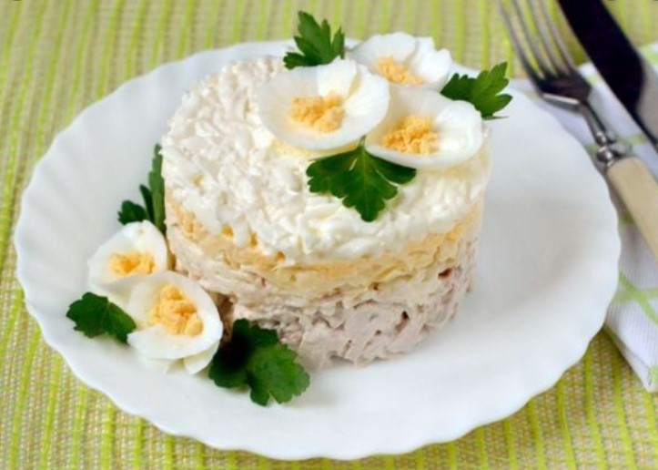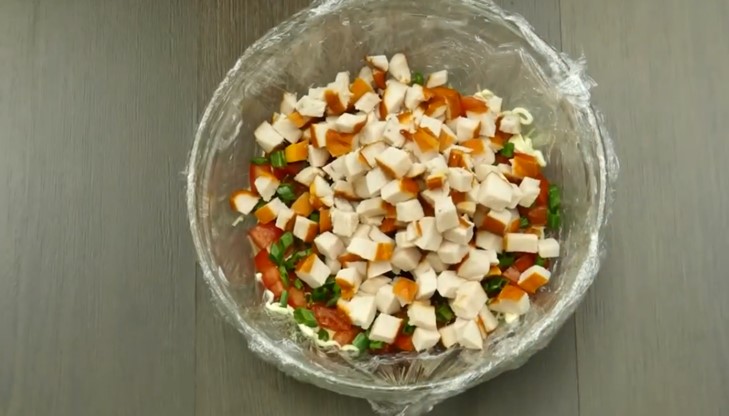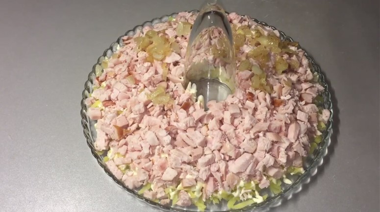 Замість копченої курки можна взяти варену. Але смак виявиться більш плоский, тому рекомендується ще додати шар тертого сиру.