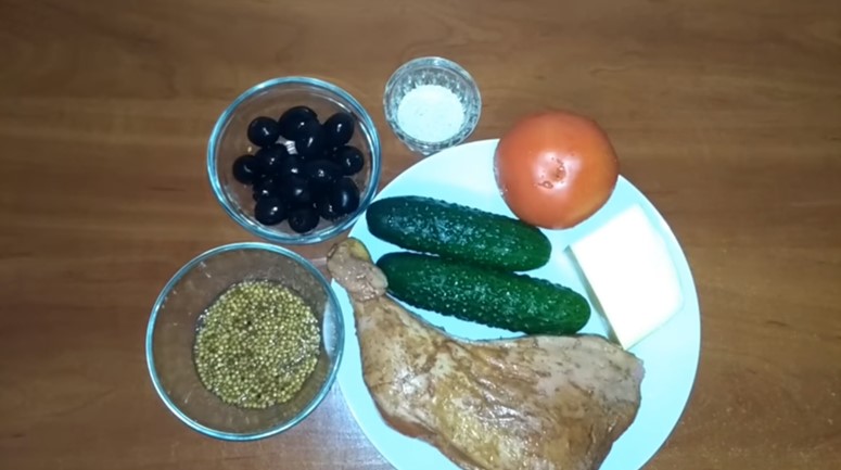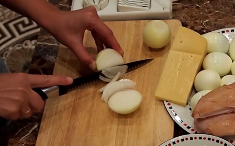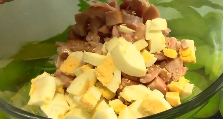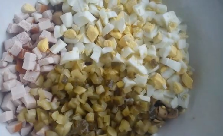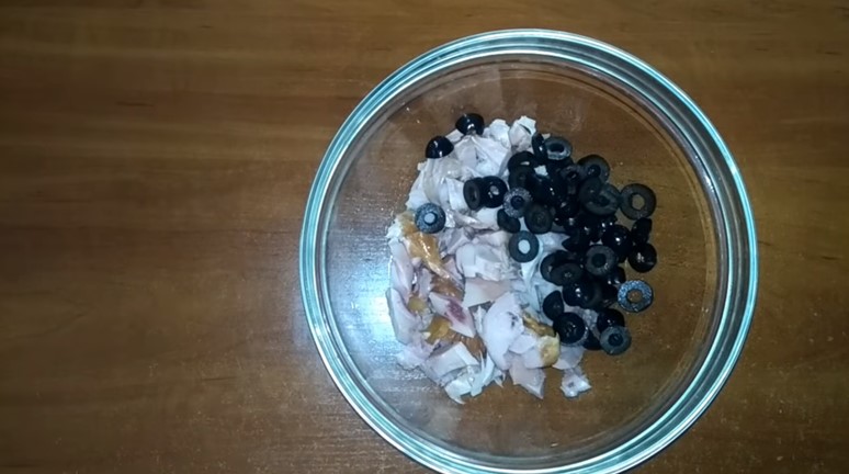 1. Необхідно взяти всі заявлені продукти приблизно в однаковій кількості. Курку розібрати на волокна, порізати кубиком. Яйця – полуломтиками.