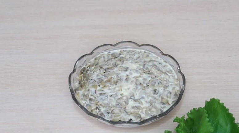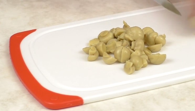 Для салату підійдуть як свіжі, так і заморожені гриби. Заморожуванню треба дати відтанути і злити зайву рідину, щоб салат потім не «пішов водою».