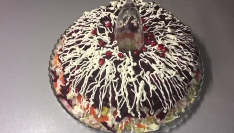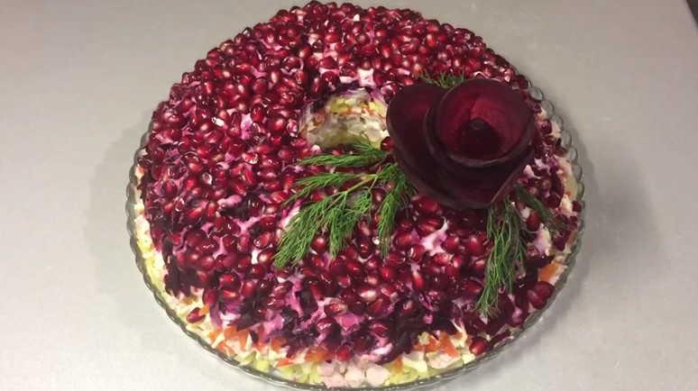 5. Останній шар – буряк. Її треба розподілити рівномірно по всій поверхні, щоб салат став бордового кольору, змастити соусом. Прикрасити зернами граната.