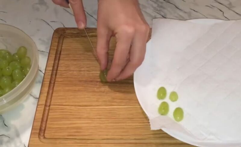 4. Для цього салату краще брати виноград без кісточок. Добре промийте ягоди. Потім на плоску тарілку розстеліть паперовий рушник, далі розрізаємо кожну ягоду навпіл і кладемо половинки зрізом вниз на тарілочку. Таким чином рушник вбере зайву рідину.