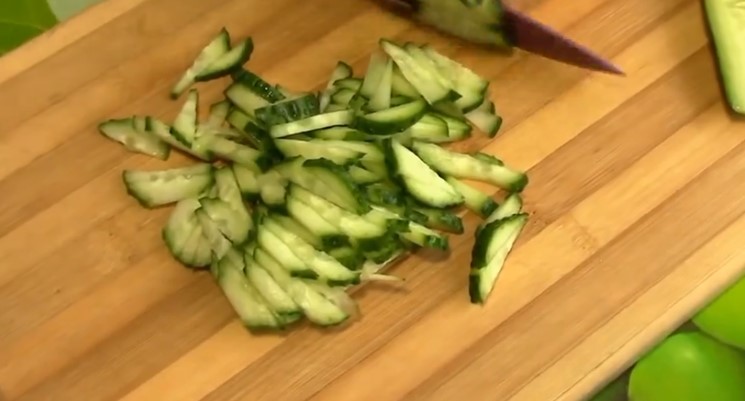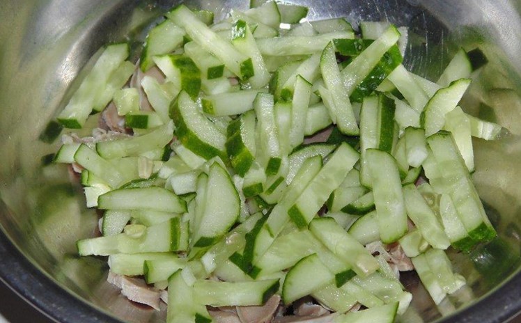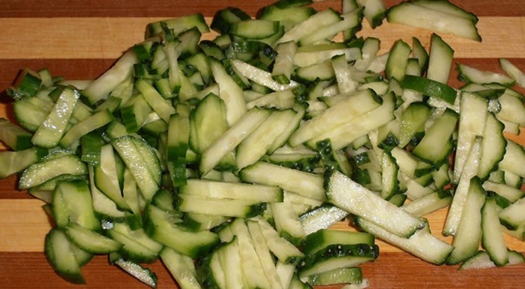 2. Огірок порізати соломкою. Чистити від шкірки треба тільки старі, грубі овочі. Але краще вибрати молоді плоди, шкурка потрібна для фактури.