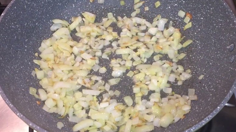 1. Цибулю дрібно порізати, гриби скибочками. Підсмажити на невеликій кількості рослинного масла. Сковороду можна накрити кришкою, так продукти швидко приготуються і залишаться соковитими.
