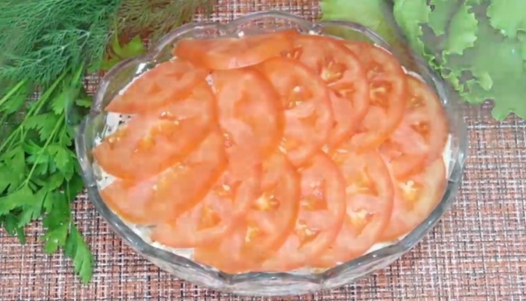 7. Далі йде друге яйце, також подрібнене на дрібній тертці. Фінальний штрих – помідори, порізані тонкими скибочками. Їх треба укласти щільним шаром внапуск.