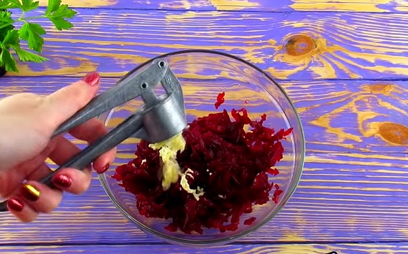 5. Тепер нам потрібно варений буряк натерти на крупній тертці на окрему миску і пропустити туди ж через прес часник. Перемішати все. Викладаємо буряк 5-тою шаром. Змастити майонезом.