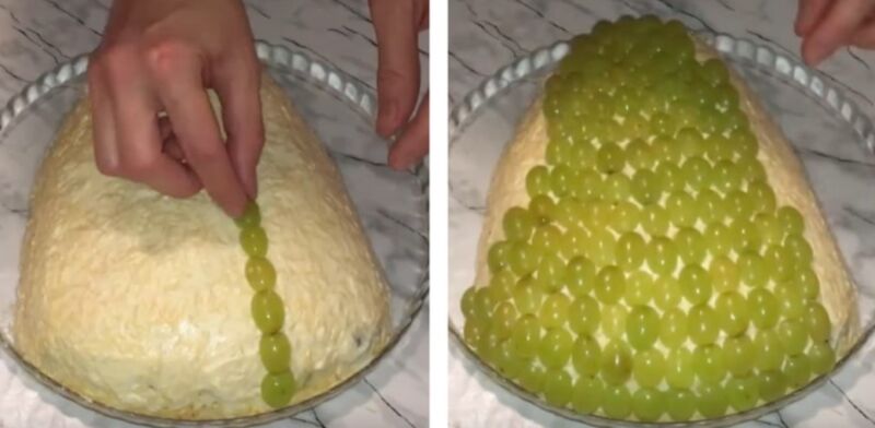 7. Завершальний етап — оформлення. Щільно один до одного викладаємо половинки винограду.