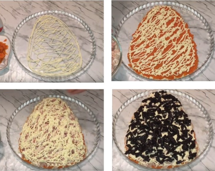 5. Тепер, коли всі підготовлені інгредієнти — збираємо закуску. Беремо велике плоске блюдо. Майонезом малюємо форму нашого салату, кладемо першим шаром морква не виходячи за контуру, солимо і робимо майонезну сіточку. Далі розподіляємо курочку+ майонезна сітка. На курка кладемо чорнослив (його змащувати майонезом не потрібно)