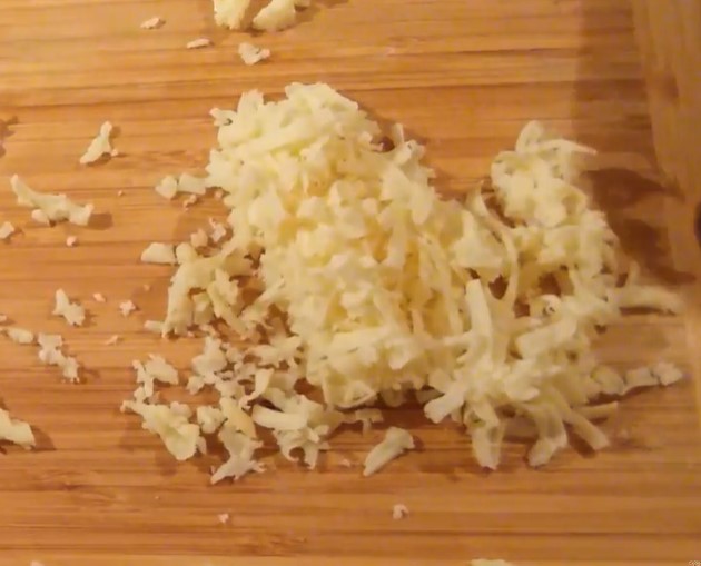 5. Твердий сир натираємо на тертці великого розміру. Ось і всі інгредієнти, ми накришили. Тепер потрібно посолити за смаком, додати мариновану цибулю.