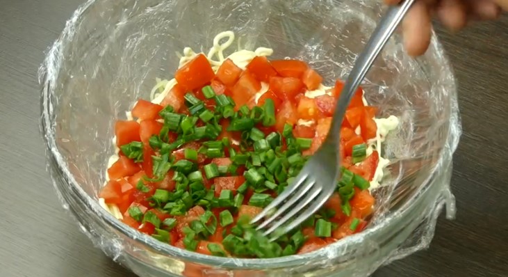 3. Помідори порізати дрібним кубиком, пересипати в окрему миску. Видавити туди часник за смаком, посолити і поперчити. Перемішати. Цю суміш викласти третім шаром.