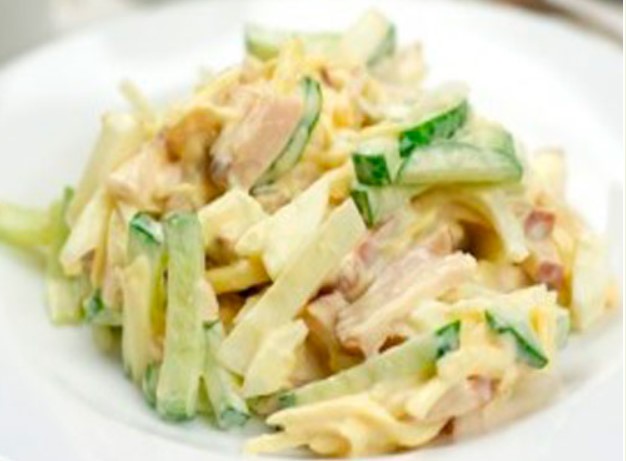 Салат з копченим окорочком, свіжим огірком і ананасами
