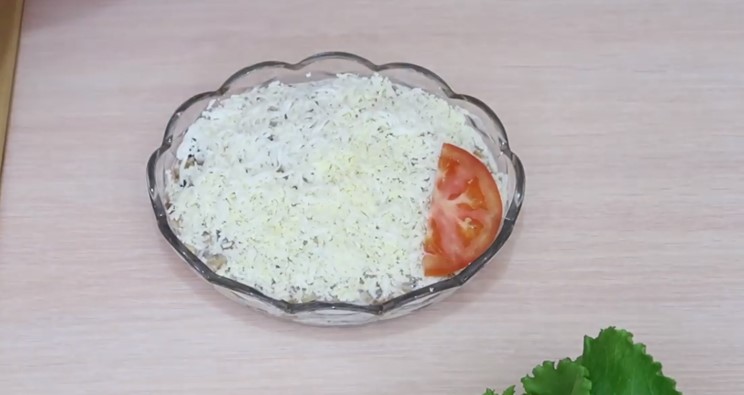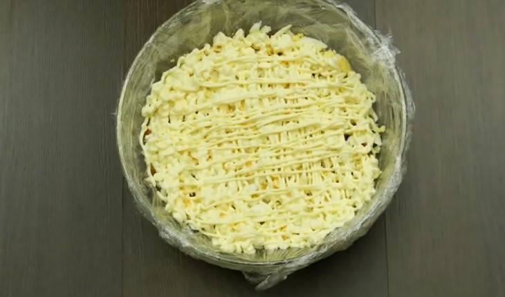 6. Останній шостий шар — яйця. Натираємо їх на тертці крупно розміру, викладаємо шар промазуємо майонезом і ставимо в холодильник для просочення на 10-12 годин.