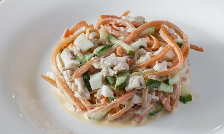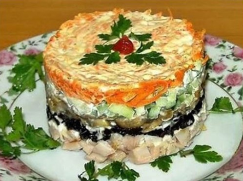 Дуже смачний салат з копченою куркою, корейською морквою і грибами