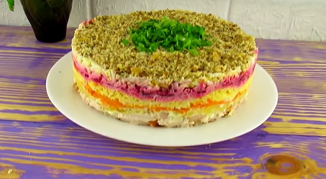 По закінченні відведеного часу посипаємо салат подрібненими горіхами, для краси посипати у середині січеною петрушкою.