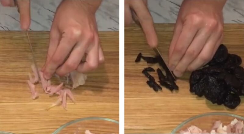 Курку зняти з кісток, прибрати шкіру, порізати. Чорнослив промити, обдати окропом і злити, після порізати соломкою.
