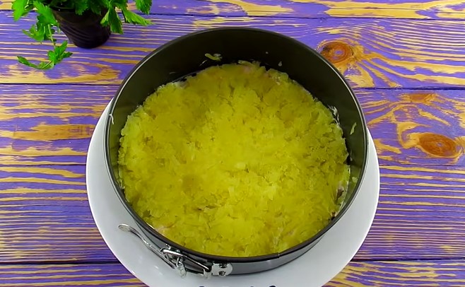 Ставимо в холод, щоб шари просочилися майонезом. Перед подачею знімаємо форму.