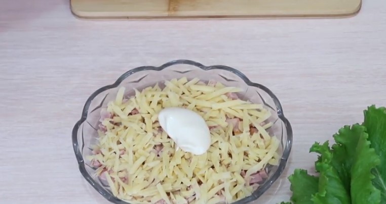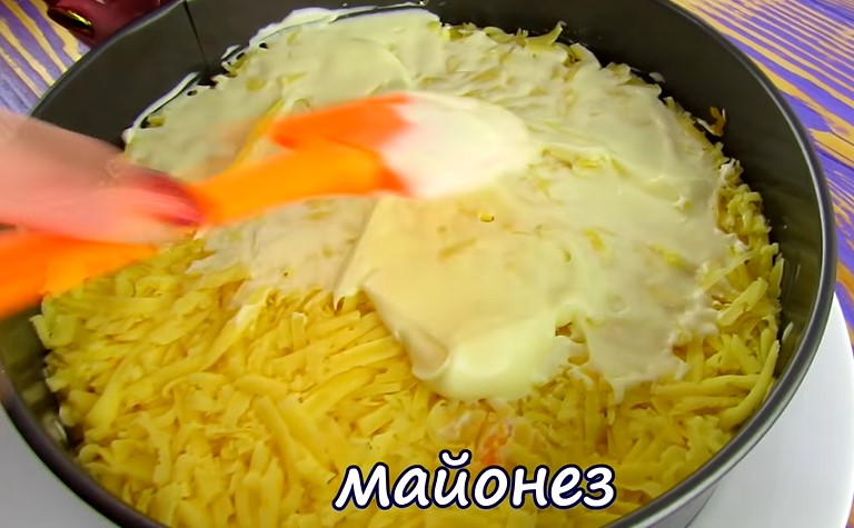 4. Далі додати сир, подрібнений на крупній тертці і промазати майонезом.