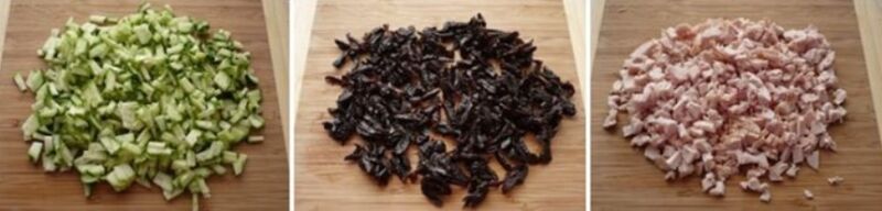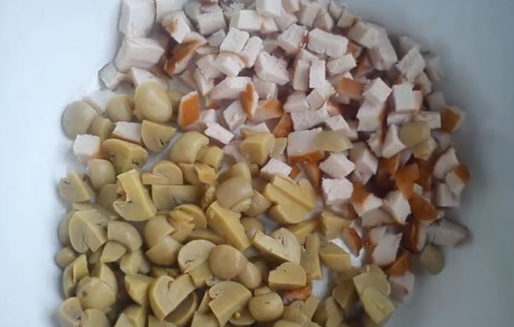 1. М’ясо зняти з кісток, порізати невеликим кубиком. Гриби порізати шматочками (не плоскими скибочками, а саме об’ємними шматочками).