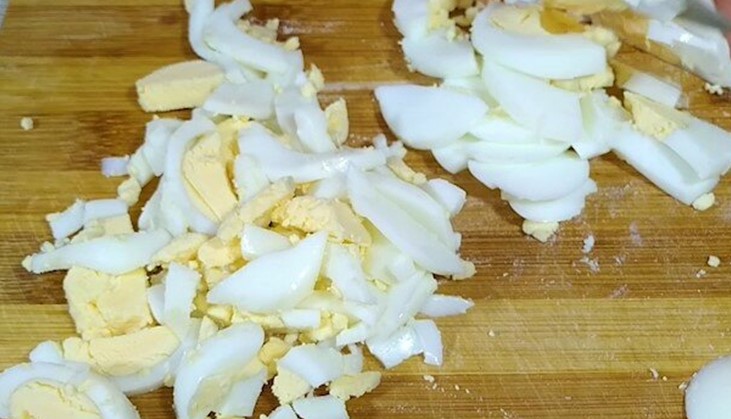 2. Відварені яйця нарізаємо кубиками, якщо є яйцерезка, то саме час нею скористатися. Я дуже люблю це пристосування, що значно скорочує час на подрібнення яєць.