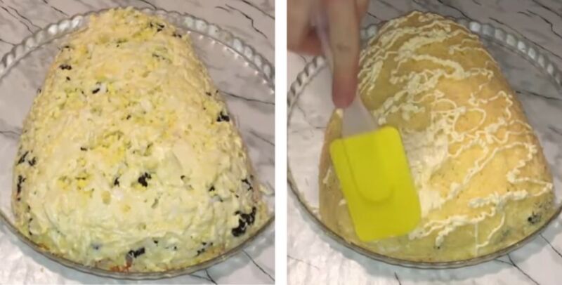 6. На чорнослив викладаємо терті яйця, солимо за смаком і робимо сіточку з майонезу. Наступний шар — твердий сир, його потрібно рясно змастити майонезом і розподілити по всій поверхні рівним шаром.