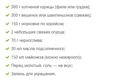 2. Поки грибочки обсмажуються, залити чорнослив киплячою водою і залишити на десять хвилин. Після того, як зазначений час піде, злити воду і порізати шматочками, якщо є кісточки, то вийняти їх. Куряче м’ясо і огірки нарізаємо кубиками. Морква по-корейськи віджати від маринаду і порізати.