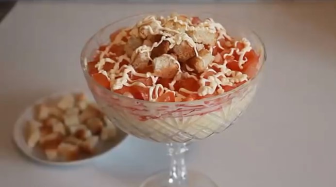 Дуже швидкий і неймовірно смачний салат можна приготувати з помідорами і сухариками. Це рецепт із серії «гості на порозі», так як нічого не треба замочувати, відварювати. Всі продукти треба просто порізати, з’єднати і подати до столу.