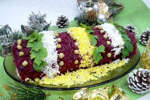 За складом, закуска нагадує всіма улюблену оселедець під шубою, але в оригінальній інтерпретації.
