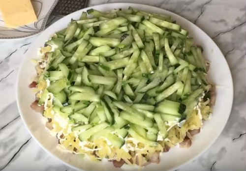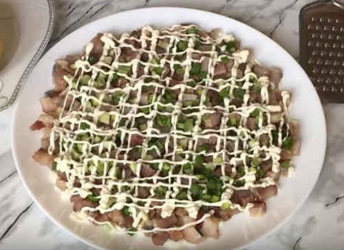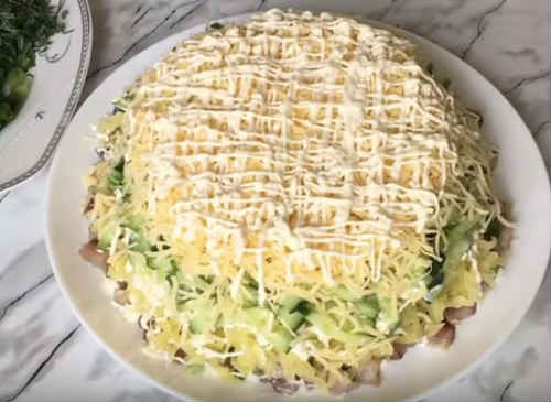 У народі страва має просту назву «салат під зеленою шубою». Приготування його не складе труднощів, а смак порадує. Зверніть увагу, що кожен наступний шар по діаметру вже попереднього.