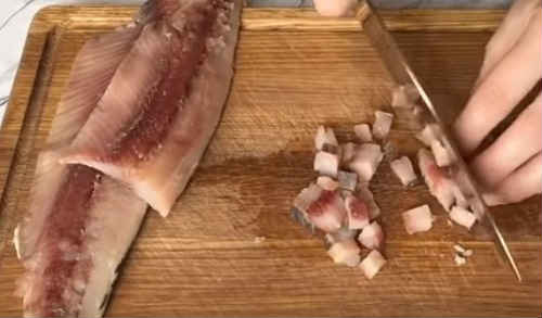 - Оселедець обробити, поділіть маленькими кубиками. Покришіть зелень.