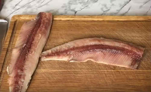 Зніміть з оселедця шкірку, відріжте голову і хвостову частину. Звільніть від нутрощів, видаліть хребет. Перегляньте філе, на предмет маленьких кісточок, виберіть при необхідності.