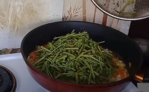 - Поріжте пагони папороті шматочками, відправте на сковороду. Зменшіть потужність вогню, тушкуйте 5-7 хвилин. вимкніть і остудіть.