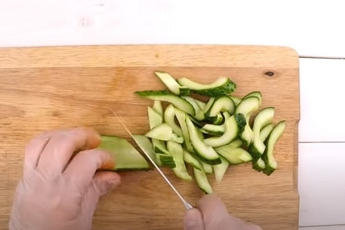 Огірки розріжте уздовж і навпіл. Виріжте насінну частину. Покришіть брусочками. Дрібно покришіть часник.