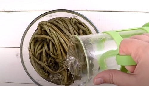 Замочіть свіжі пагони в підсоленій воді на добу. Кілька разів за цей час міняйте розсіл.