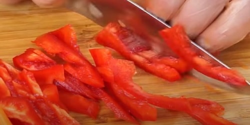 У болгарських перців видалити насіння з перегородками, м’якоть наріжте соломкою.