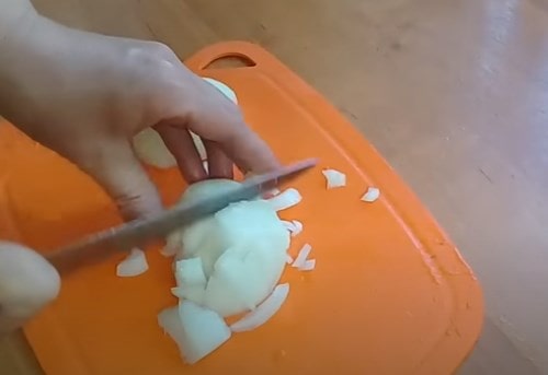 - Наріжте цибулю півкільцями. Припустіть нарізку до напівпрозорості.