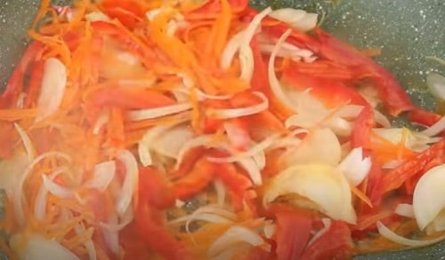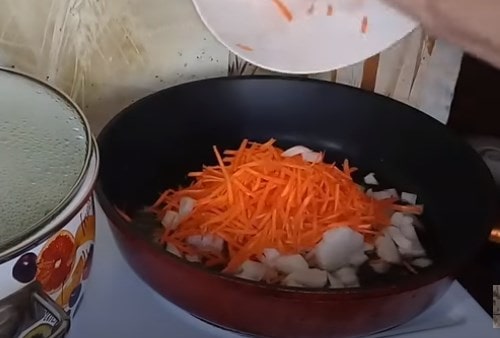 - Нашаткуйте півкільцями цибулину, крупно потріть моркву. Обсмажте овочі до прозорості.