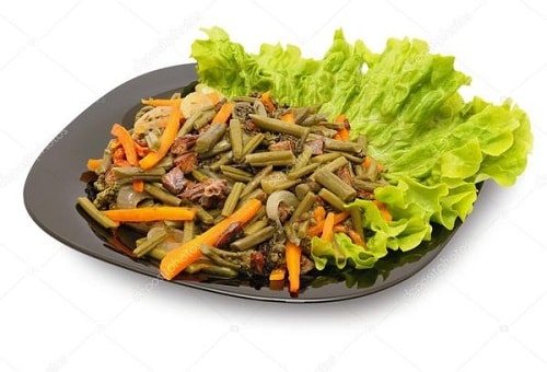 Незвичайний салат готується і подається в основному на свята. В оригіналі має назву Косарі-ча. Пагони додають закуски грибний смак. На приготування допустимо брати не тільки свинину, яловичина також підійде непогано.