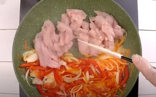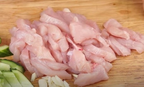 Сире куряче м’ясо поділіть великими смужками.