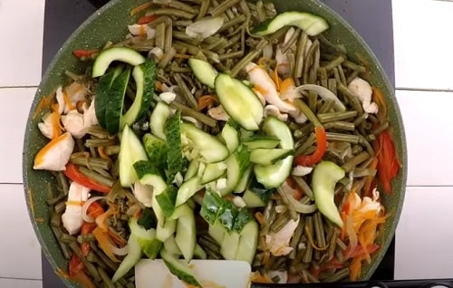 Відразу додайте огіркову нарізку, часник. Смажте 4-5 хвилинки.
