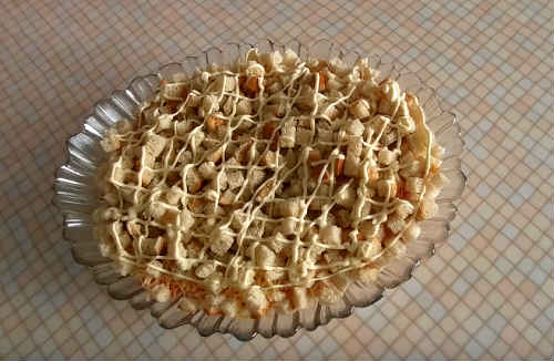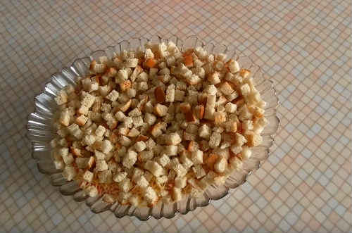 Розкидайте поверх сухарики. Тут враховуйте час до подачі на стіл. Якщо подаєте не відразу, сухарі не кладіть, посипте безпосередньо перед подаванням, оскільки вони розм’якнуть.