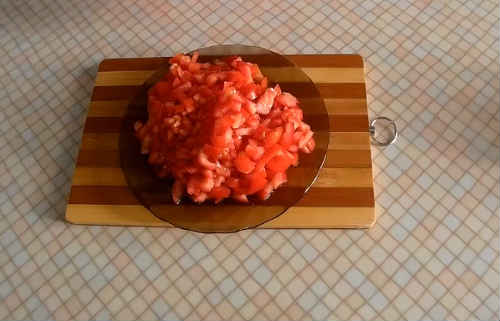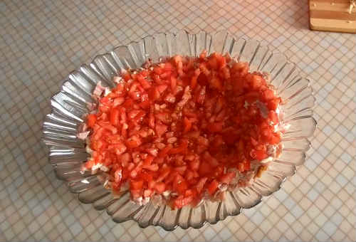 Поверх курки укладіть помідорну нарізку. Намалюйте майонезну сітку, але не надто багато.