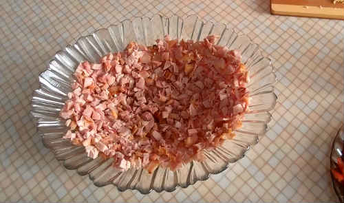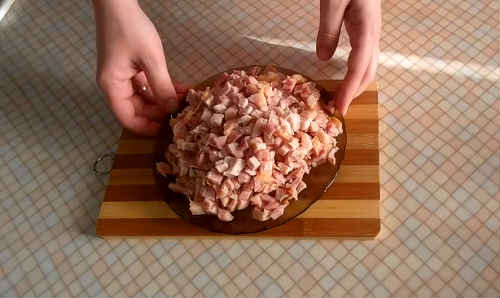 Зібрати салат нескладно: на широкому блюді розкладіть нижній шар з курячого м’яса. Щедро покрийте майонезом. Останнім часом, щоб м’ясо краще просочилося, я спочатку перемішую курку з соусом, а потім викладаю шаром.