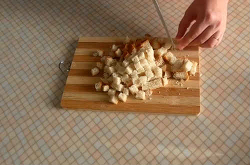 Приготування почніть з сухариків. Робіть побільше, знадобляться інші страви, до супу, наприклад. Покришіть батон кубиками. Викладіть на піднос, збризніть маслом і відправте в духовку на 15-20 хвилин. Температуру робіть не більше 150 про С. Коли заготовки зарум’яняться, діставайте.