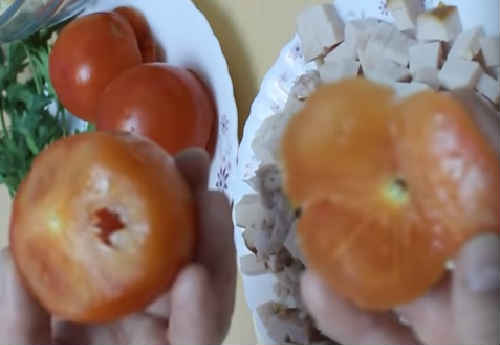 Якщо хочете прикрасити закуску маками, перед нарізкою зріжте з томатів кришечку. В перевернутому вигляді вона буде нагадувати квітку.