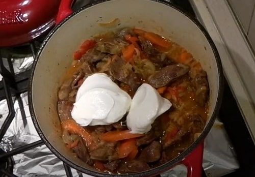 Незадовго до закінчення додайте сметану. Розмішайте, протушкувати ще буквально пару хвилин.