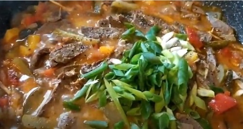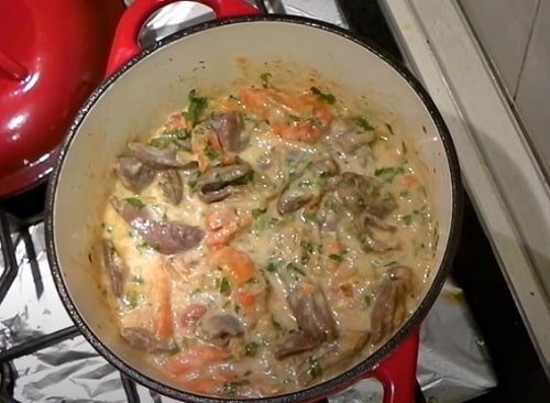 - Залийте вміст вершками, дайте закипіти. Гасіть при тихому кипінні до м'якості субпродукту. періодично помішуйте, обов'язково накрийте кришкою.